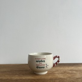 La tasse est en grès aux couleurs de Noël, et décorée de la citation "candy cane wishes and mistletoe kisses". Elle est dotée d'une poignée peinte à la main.